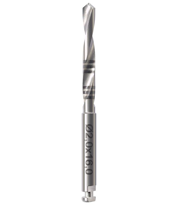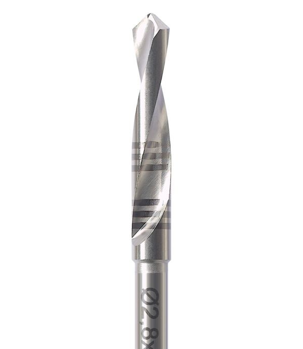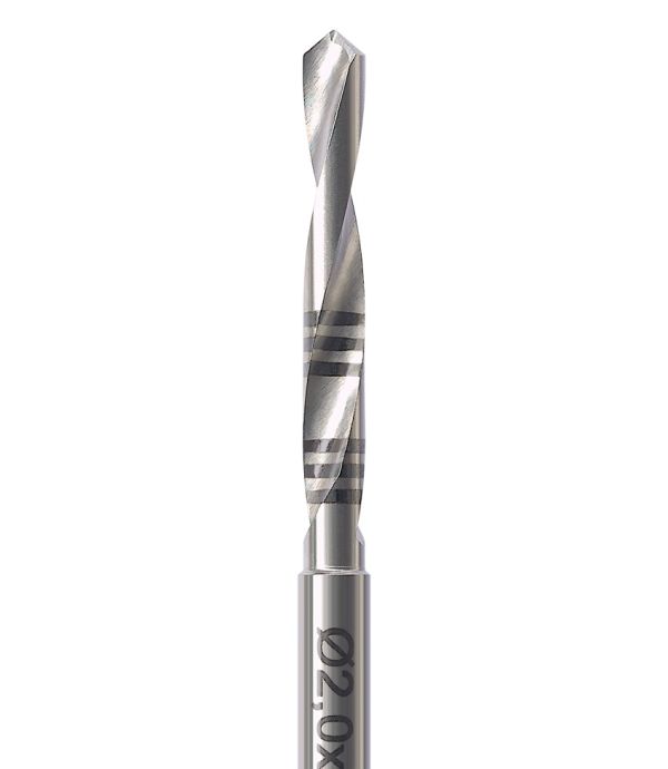 Wiertło wykonane ze stali chirurgicznej przeznaczone do pracy na kątnicy chirurgicznej. Na ostrzach znajduje się znacznik głębokości.