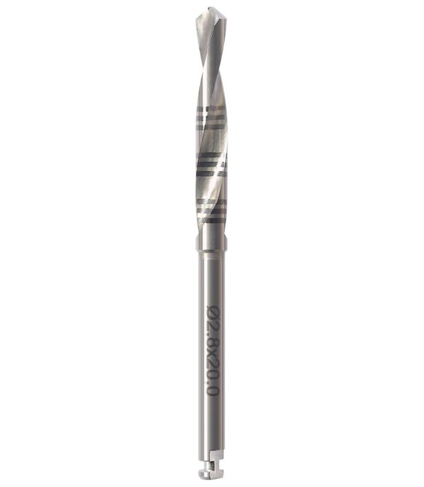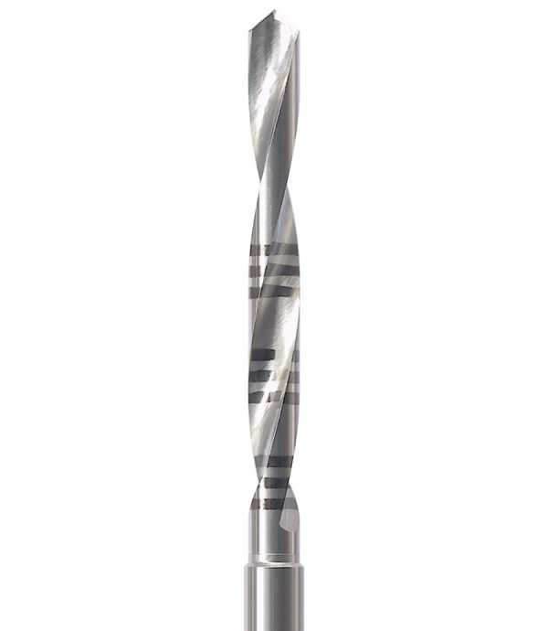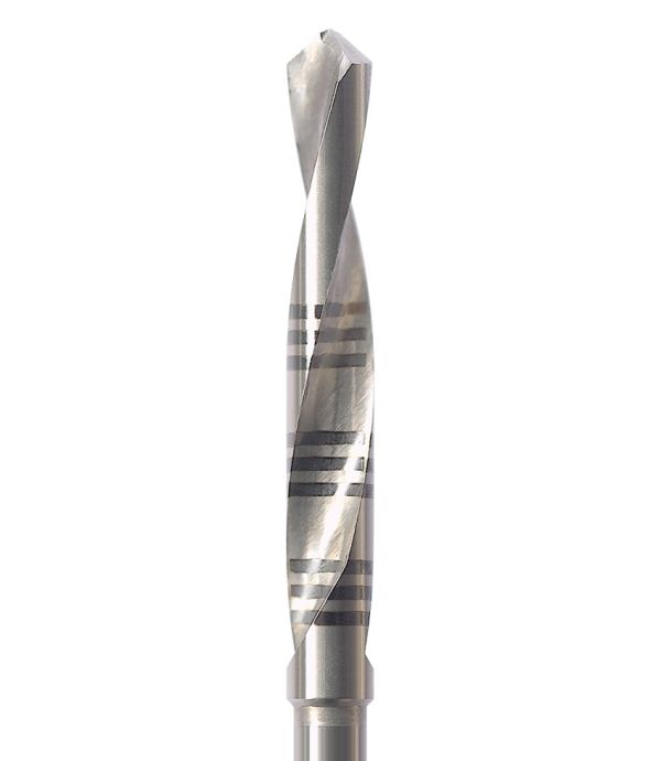 Wiertło wykonane ze stali chirurgicznej przeznaczone do pracy na kątnicy chirurgicznej. Na ostrzach znajduje się znacznik głębokości.