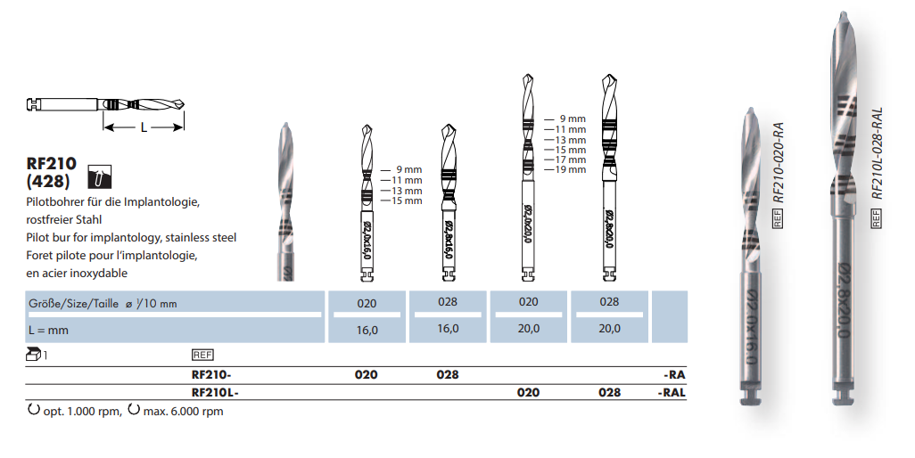 Pilot RF210L oferowany jest w dwóch rozmiarach: 020 lub 028. W ofercie można również znaleźć krótszą wersję tego wiertła - pilot RF210 przeznaczony na kątnicę RA o dł. 22 mm.