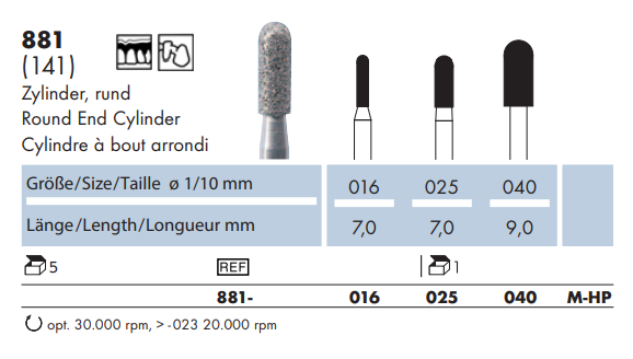 Zalecane obroty dla frezów 881 HP zależą od rozmiaru wiertła.