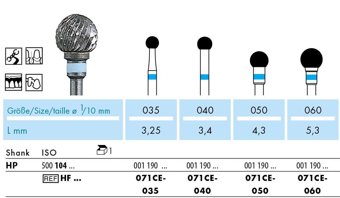 Frez HF071CE to kulka z niebieskim paskiem o ostrzach krzyżowych. Jest to jeden z najbardziej uniwersalnych typów frezów. Służy do zbierania akrylu i metalu.