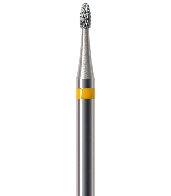 To, co wyróżnia frezy protetyczne z pomarańczowym paskiem, to sposób ich pracy. Ich zaletą jest to, że znakomicie zbierają, a jednocześnie zostawiają wygładzoną powierzchnię. Takie frezowanie w dużym stopniu przyspiesza obróbkę materiału. Powierzchnia po zebraniu nadmiarów lub korekcie kształtu wykonanych tym frezem nie wymaga już dodatkowego wygładzania innymi instrumentami.