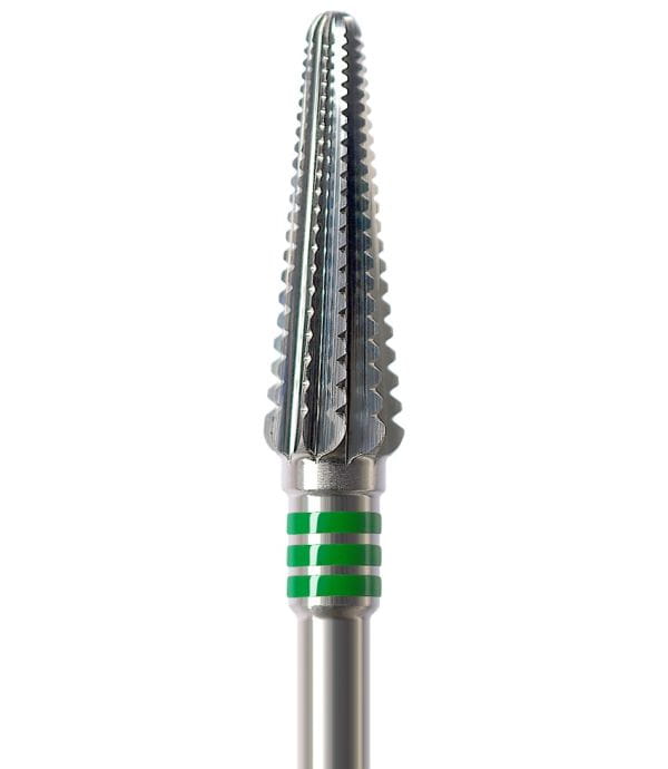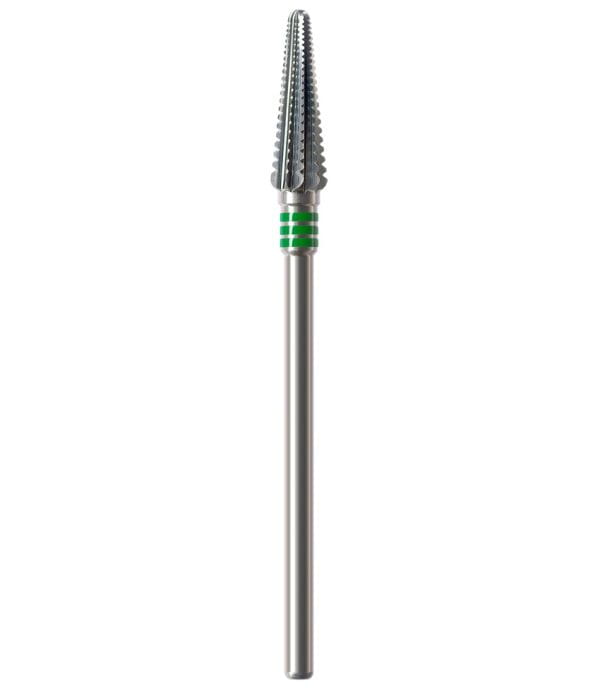 Frez HF079QSCN-045 to stożek z trzema zielonymi paskami. Ostrza ułożone są w kształcie "jeżyka".