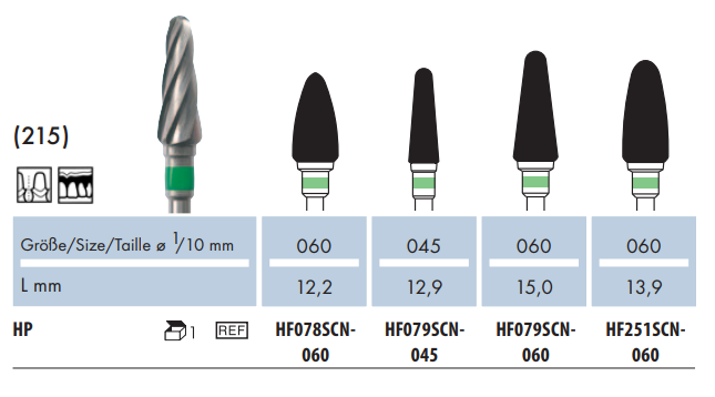 Frez HF079SCN to stożek z zielonym paskiem o równoległych ostrzach. Oferowany jest w dwóch wielkościach: 045 oraz 060.