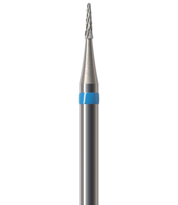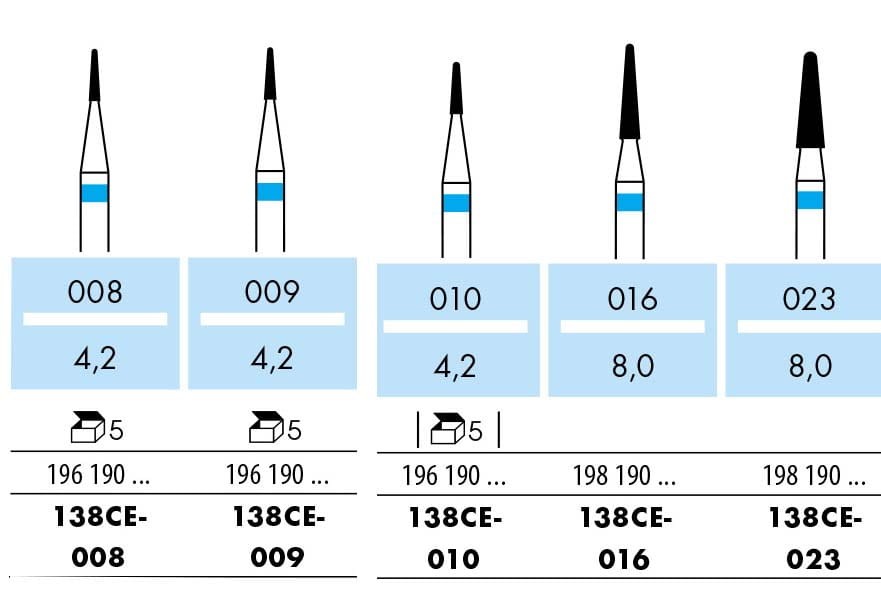 Frez HF138CE to mały stożek z niebieskim paskiem o ostrzach krzyżowych. To jeden z najbardziej uniwersalnych typów frezów. Służy do obróbki metalu. Oferowany jest w czterech rozmiarach: 008, 010, 016 oraz 023.
