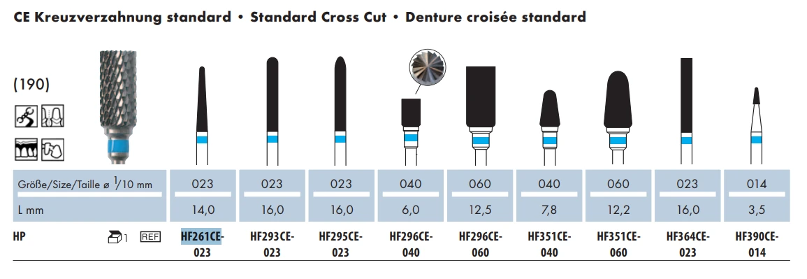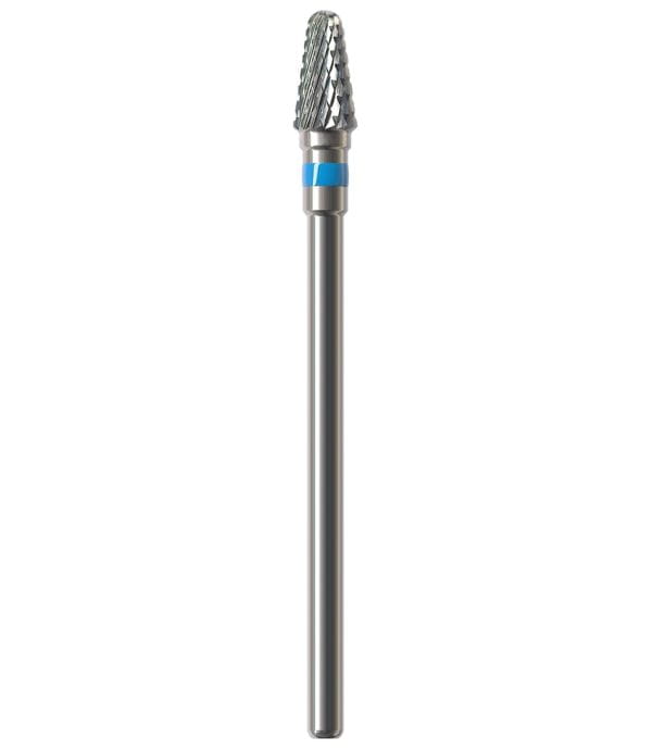 Frez HF351CE to gruby, obło zakończony stożek z niebieskim paskiem o ostrzach krzyżowych. Dedykowany do zbierania akrylu i metalu. Oferowany jest w dwóch rozmiarach: 040 lub 060.