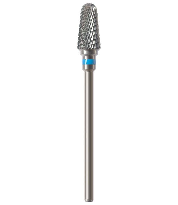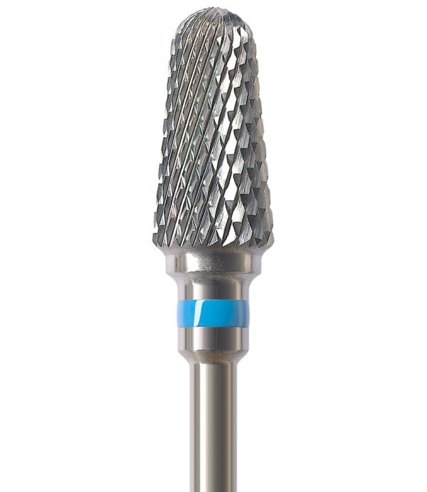 Frez HF351CE to gruby, obło zakończony stożek z niebieskim paskiem o ostrzach krzyżowych. Dedykowany do zbierania akrylu i metalu. Oferowany jest w dwóch rozmiarach: 040 lub 060.