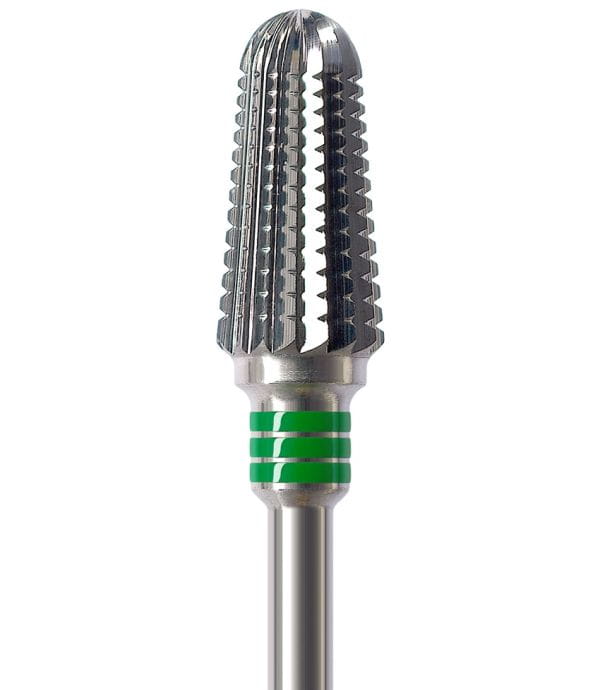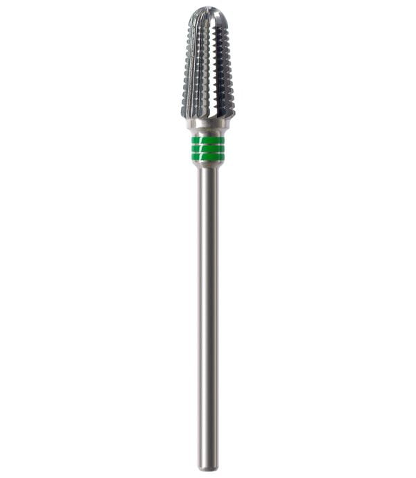 Frez HF351QSCN to gruby, zaokrąglony stożek z trzema zielonymi paskami, oferowany w dwóch rozmiarach: 060 lub 070. Ostrza ułożone są w kształcie "jeżyka".