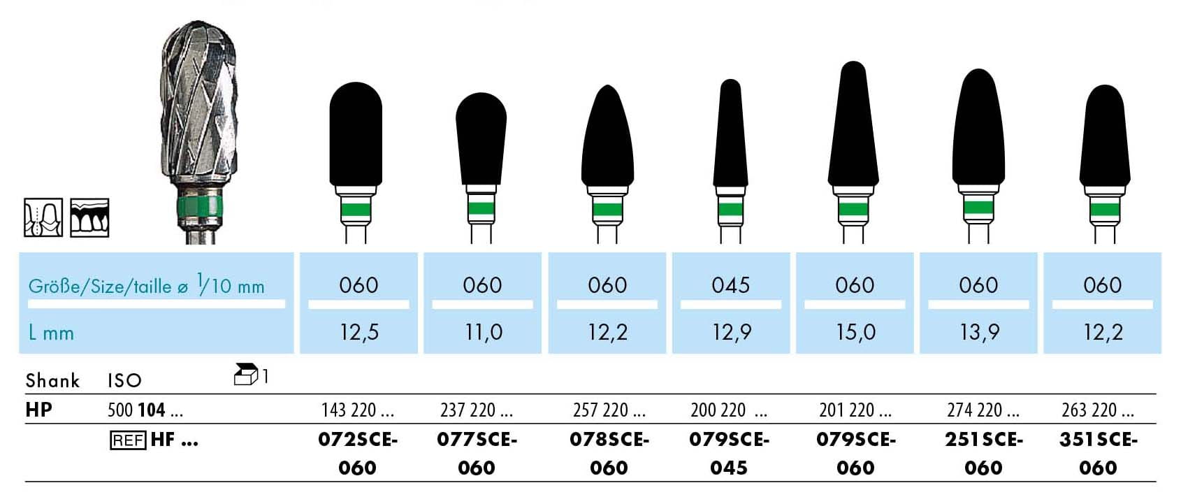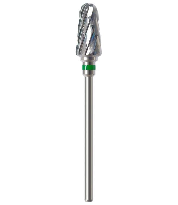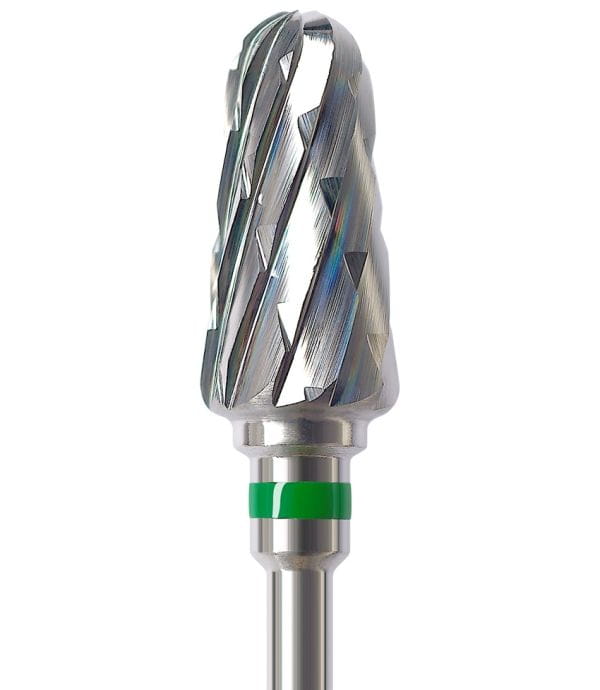 Frez HF351SCE to gruby, zaokrąglony stożek z zielonym paskiem o ostrzach krzyżowych. Oferowany jest w dwóch rozmiarach: 060 oraz 070.