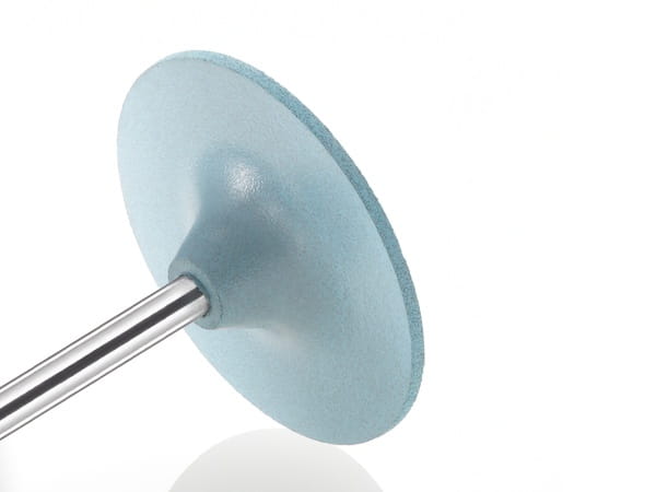 Niebieska gumka protetyczna CeraGlaze w kształcie dużej soczewki wygładza powierzchnię po abrazyjnej pracy gumki zielonej. Polecana szczególnie do pracy na tlenku cyrkonu. Znakomicie sprawdzi się na każdym rodzaju ceramiki, ale także na metalu, w tym do opracowywania tytanu.