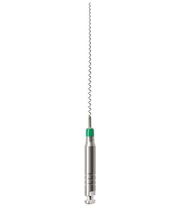 Spiralna część robocza umożliwia równomierne wprowadzanie past, cementów i uszczelniaczy. Sprężynka bezpieczeństwa zwiększa elastyczność instrumentu i pomaga ograniczyć ryzyko złamania podczas pracy obrotowej, absorbując drgania uchwytu podczas umieszczania materiału w kanale.