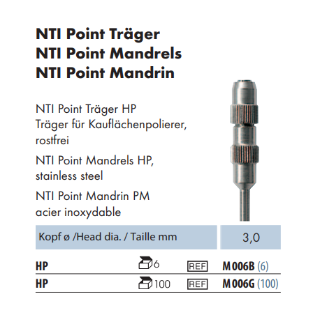 Mandryla z wysokiej jakości stali nierdzewnej przeznaczona do okluzyjnych polerek punktowych oraz stalowych szczoteczek.