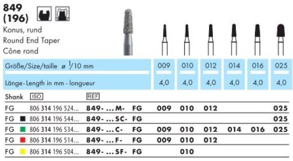 Wiertło tego typu można użyć do znoszenia szkliwa i preparacji ubytku. Oferowane w gamie sześciu wielkości od 009 do 025, w pięciu gradacjach nasypu: