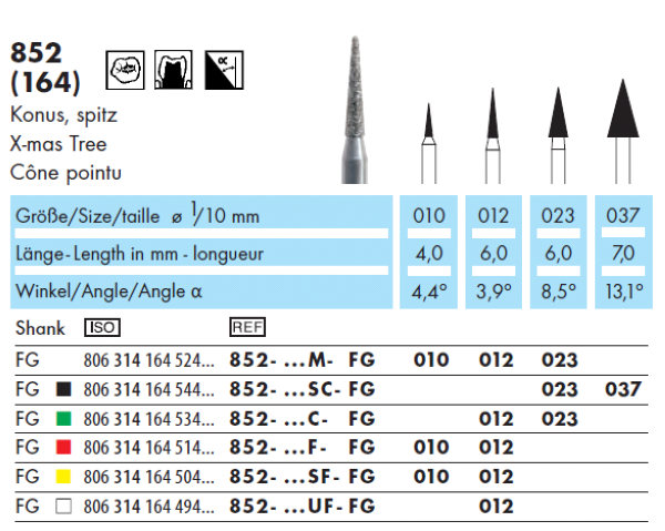 Wiertło o kształcie krótkiego szpica przeznaczone do separacji zębów przed szlifowaniem. Sprawdzi się także do opracowywania ubytków klasy drugiej. W nasypach o gradacji wygładzającej można je zastosować do wygładzania kompozytu na powierzchniach stycznych zębów. W swoim największym rozmiarze może być zastosowane do kształtowania powierzchni żującej - do wycinania lub polerowania rowków między guzkami trzonowców lub przedtrzonowców.