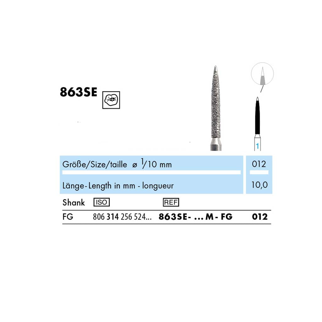 Wersja 863SE to propozycja dla klienta, który potrzebuje pozbawionego nasypu, niepracującego czubka np. żeby bezpiecznie pracować w okolicy dziąsła. Wiertło to oferowane jest tylko w jednej wielkości 012 i w jednym, uniwersalnym nasypie: